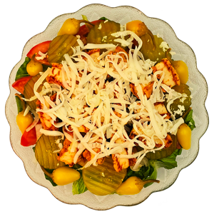 Enjoy our delicious Large Cheese Pizza with your choice of two toppings, perfectly baked to cheesy perfection. Pair it with either a side of crispy hot wings for a spicy kick or a fresh, crisp salad for a lighter option. A perfect meal for any occasion!